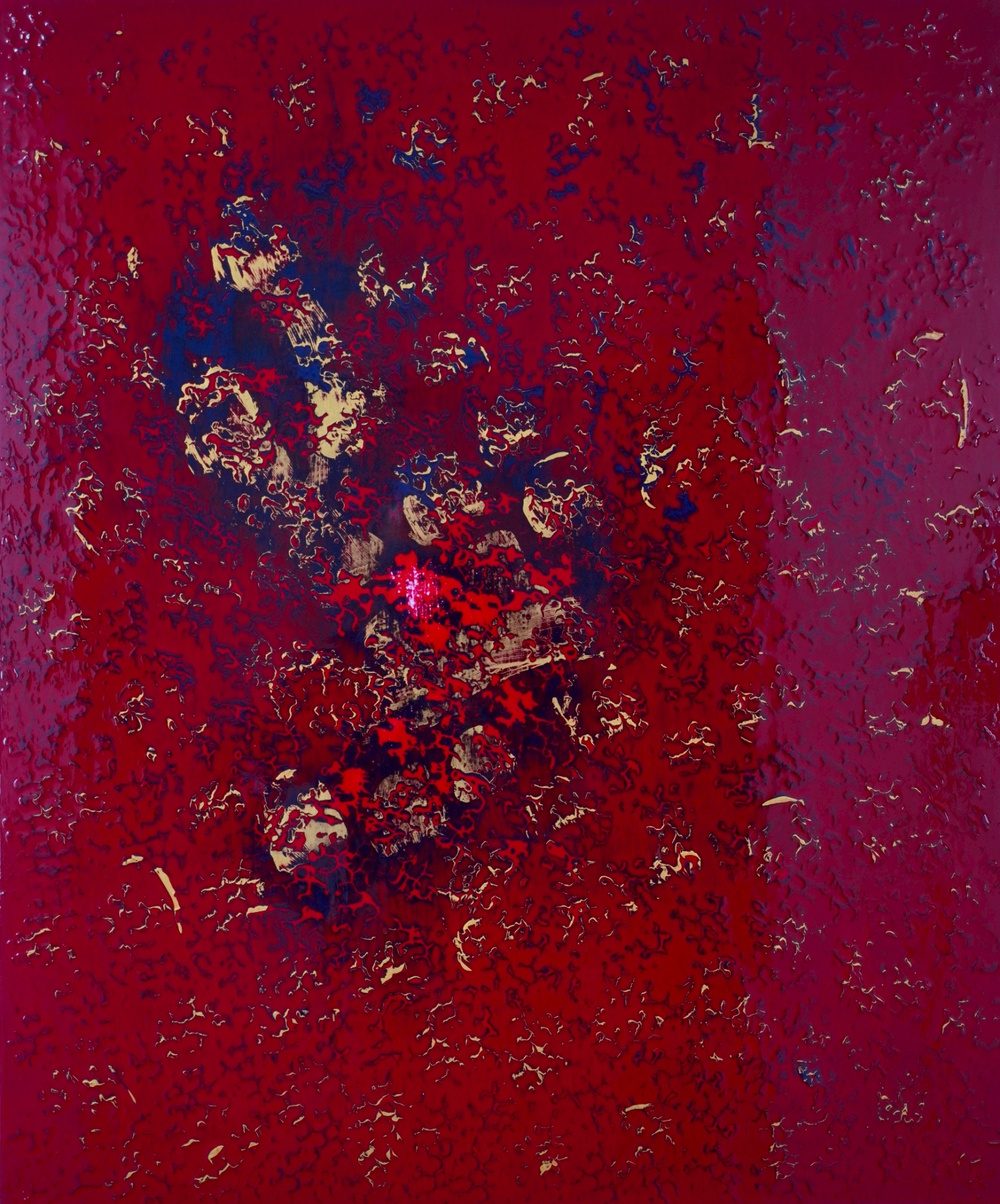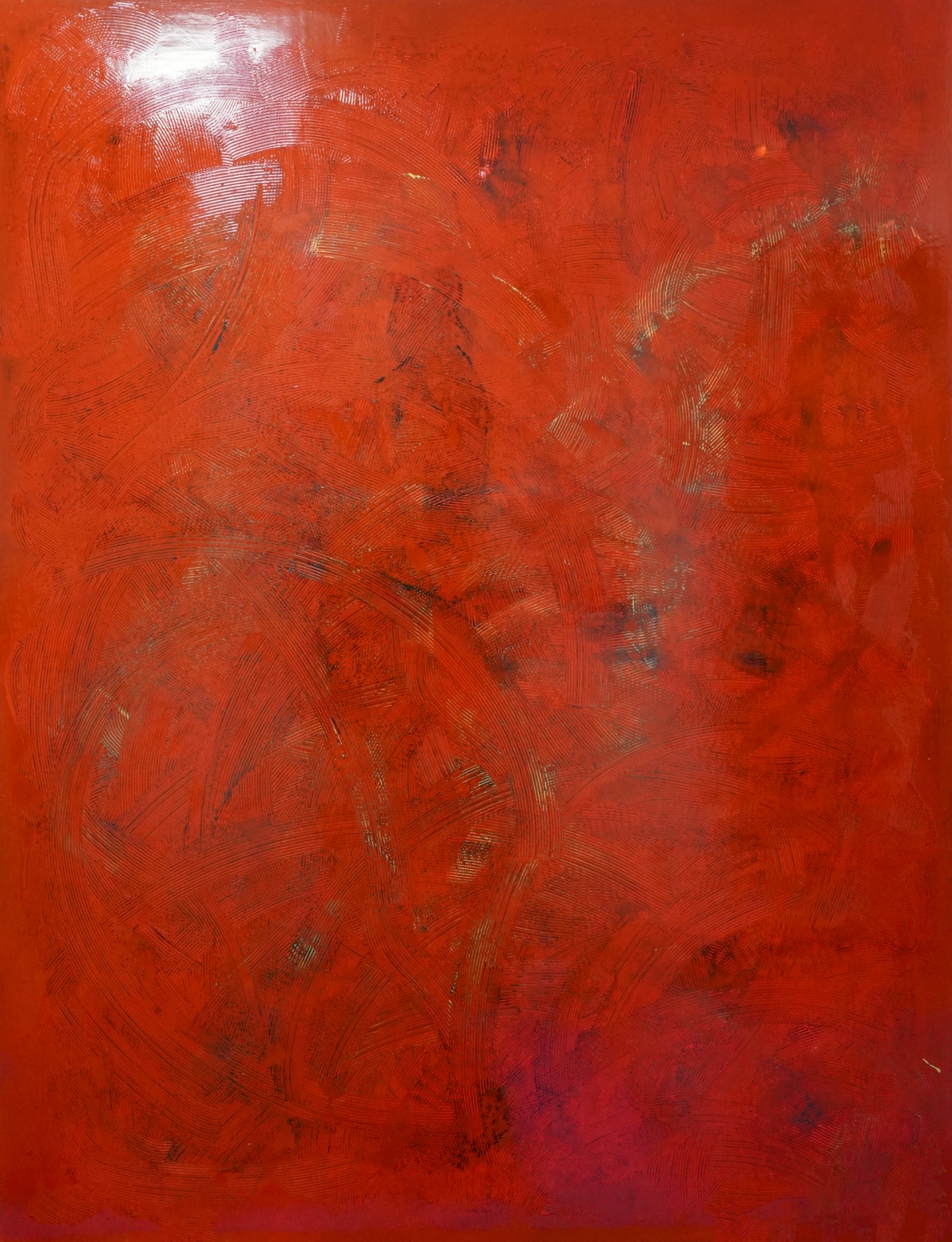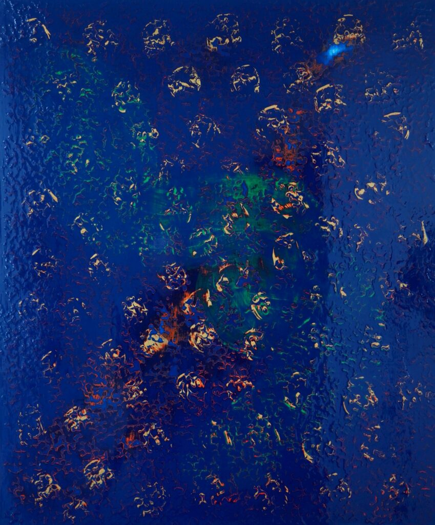 His works apply the traditional Japanese technique of “togidashi,” in which multiple layers of acrylic paint are applied and then water-brushed to reveal intricately layered traces of color beneath the scraped surface.