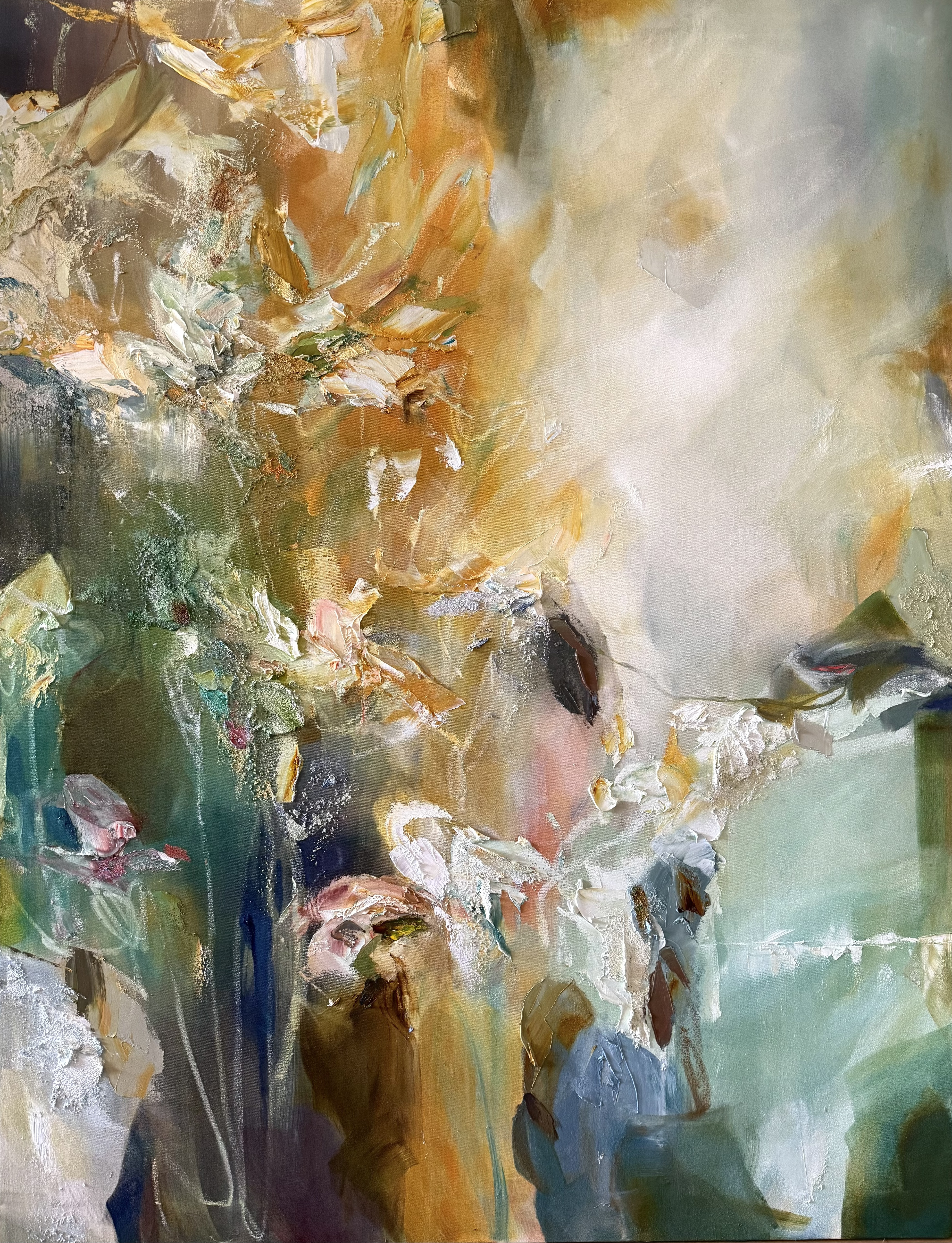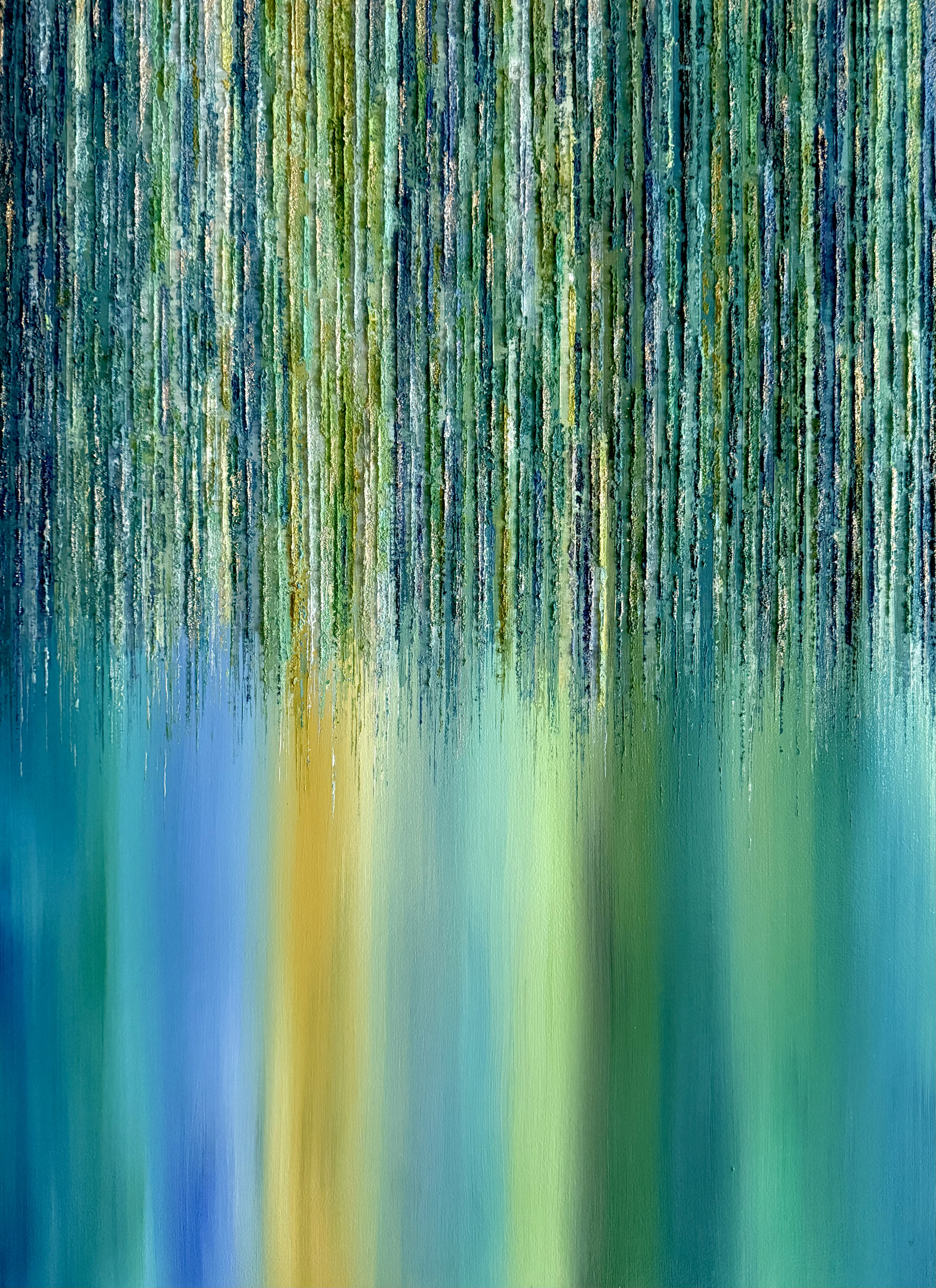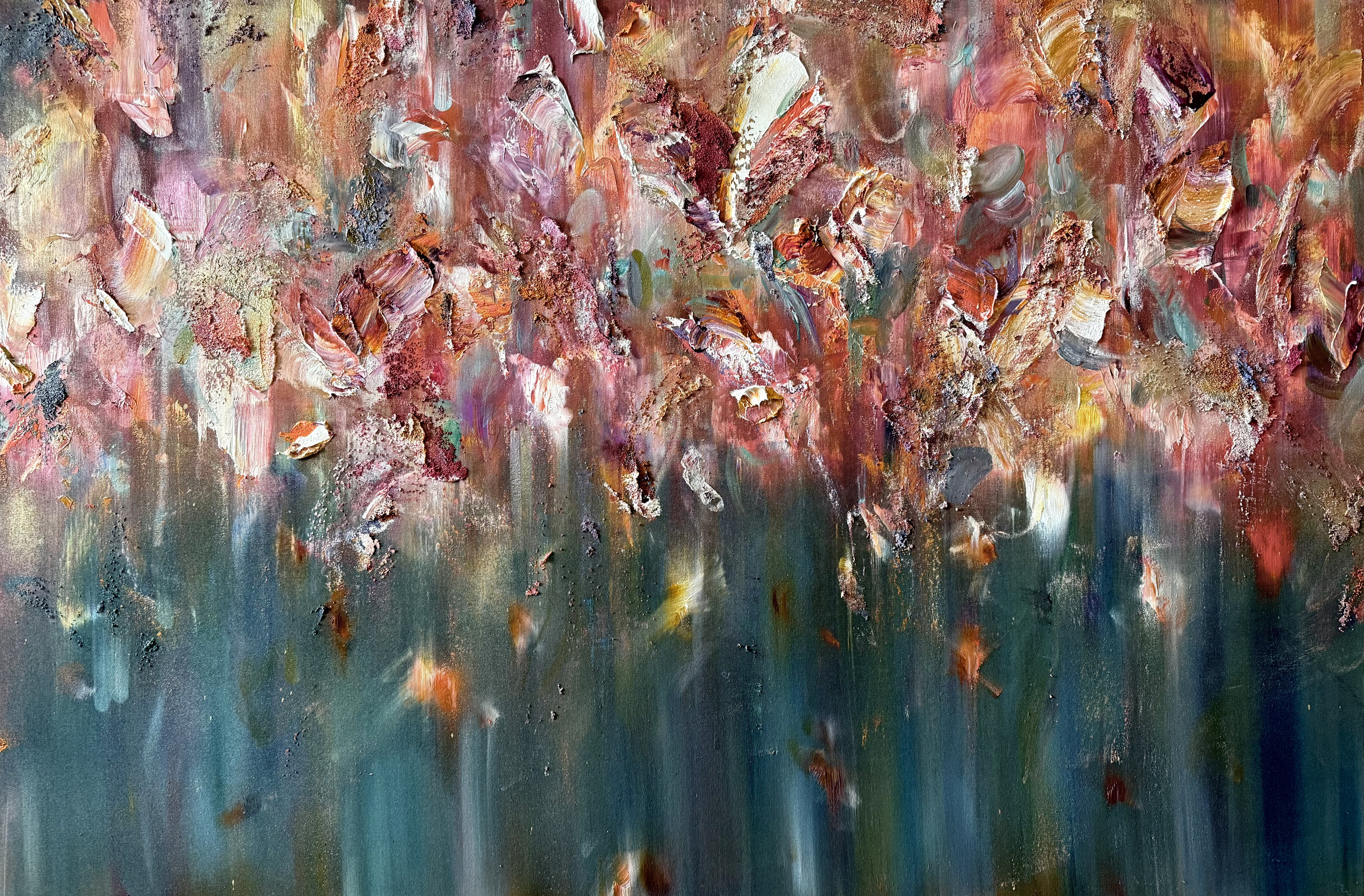 Using the presence of organic matter as a motif, he abstractly depicts accumulated “impressions” from the past—memories, sensations, and the accumulation of time—using color and texture.